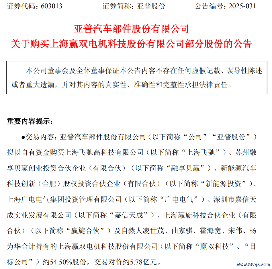 亚普股份(603013)5月27日晚间公告,为落实公司在关键汽车零部件布局的战略发展目标,加速推进公司转型发展进程,公司拟以自有资金购买上海飞驰、融享贝赢、新能源投资、广电电气、嘉信天成、赢旋合伙及自然人凌世茂、曲家骐、霍海宽、宋伟、杨为华合计持有的上海赢双电机科技股份有限公司(简称“赢双科技”)约54.50%股份,交易对价约5.78亿元。收购完成后,公司将成为赢双科技的控股股东。