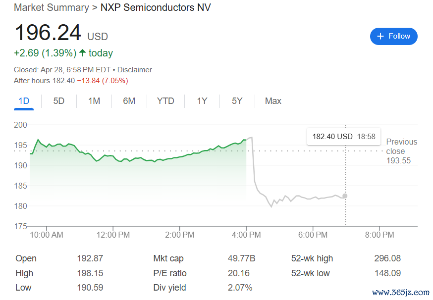 第一季度营收:同比下滑9%至28.4亿美元,略高于预期的28.3亿美元。 调整后每股收益:2.64美元,高于预期的2.58美元。 净利润方面:公司录得4.9亿美元,较去年同期的6.39亿美元同比下滑23%。 每股净收益:1.92美元,较去年同期的2.47美元下降22%。此外报道指出,NXP与STMicroelectronics和Infineon Technologies等同行一样,正在艰难应对用于电动汽车和智能手机的成熟芯片需求疲软的困境。