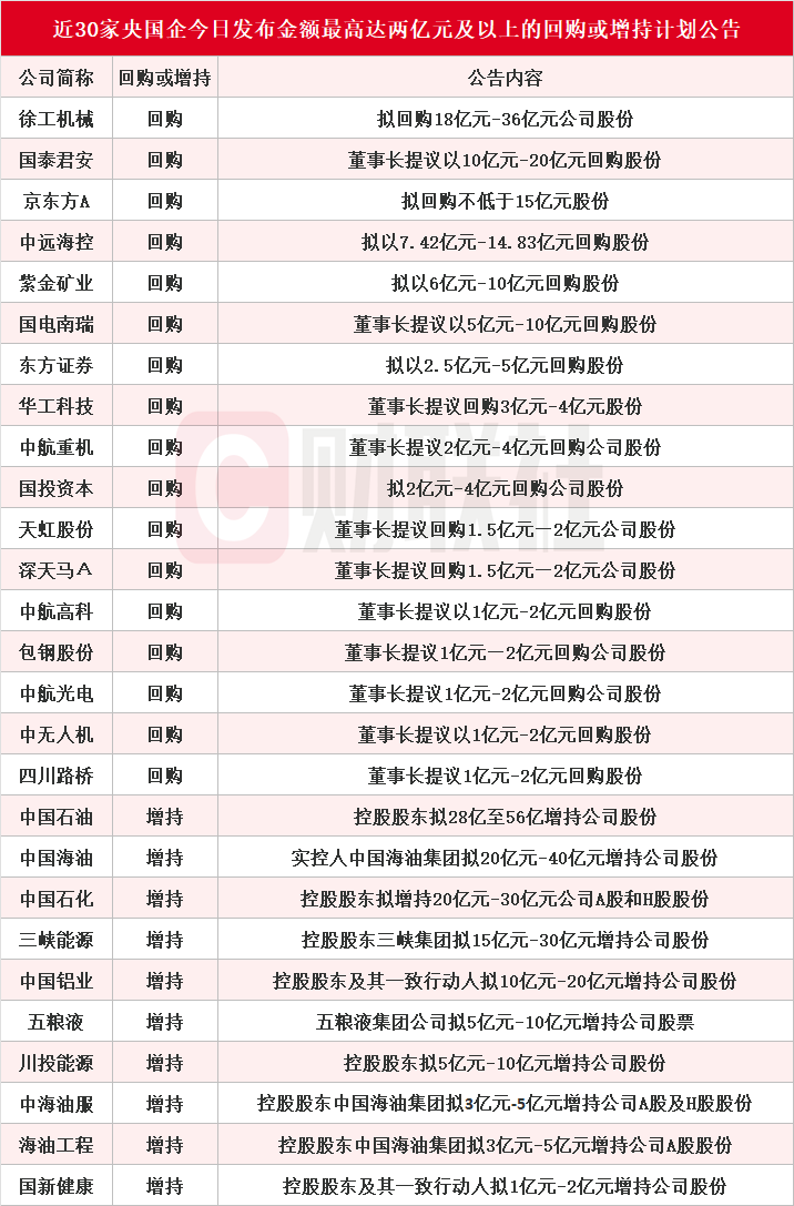截至发稿,据不完全统计中国股票配资网,今日包括徐工机械、国泰君安、京东方A、中远海控、紫金矿业、国电南瑞、东方证券、华工科技、中航重机、国投资本、天虹股份、深天马A、中航高科、包钢股份、中航光电、中无人机、四川路桥、中国石油、中国海油、中国石化、三峡能源、中国铝业、五粮液、川投能源、中海油服、海油工程、国新健康在内的27家央企或国企A股上市公司披露金额上限达两亿元及以上的回购或增持计划公告。